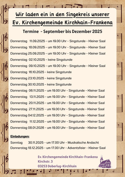 Die Evangelischen Kirchengemeinden Kirchhain und Frankena wurden durch Beschluss der Kirchenleitung zum 01.01.2025 zur Ev. Kirchengemeinde Kirchhain-Frankena vereinigt. Bitte lesen Sie dazu gern in unserem Gemeindebrief.